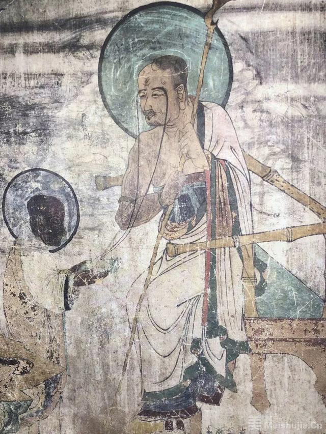 但第95窟的羅漢像把寫實(shí)與夸張結(jié)合起來,羅漢長(zhǎng)眉過膝,神態(tài)慈祥,袈裟右坦,雙手扶長(zhǎng)杖坐竹椅上,弟子恭敬的用雙手托長(zhǎng)眉,正在接受尊者的教誨。一筆而成的長(zhǎng)眉,急轉(zhuǎn)的折蘆描衣紋,長(zhǎng)杖、竹椅的線描都體現(xiàn)出了不同的質(zhì)感。羅漢像表現(xiàn)出既有普通僧人性格又有神性的羅漢形象。人物神態(tài)及衣紋、背景等畫法具有宋元以來中原繪畫風(fēng)格,體現(xiàn)著元代的新畫風(fēng)。