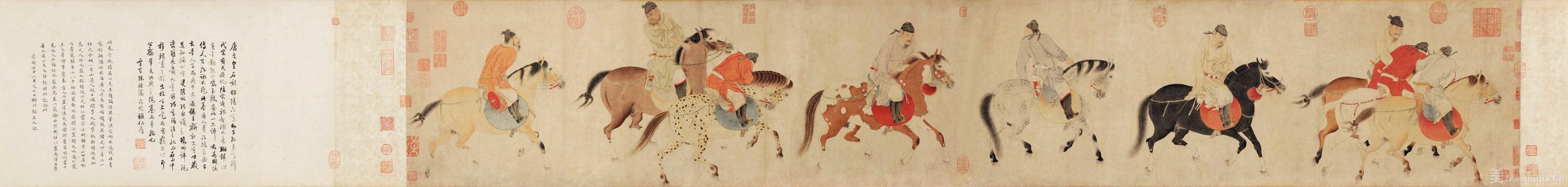 據(jù)《舊唐書》記載,唐玄宗(685—762)登基前,在興慶坊西南方置樓,常邀諸王宴飲,賦詩燕嬉,感情深厚。本幅便是描繪其身為臨淄王時,與四位兄弟出游飲宴,醉后策馬歸途的景象。畫中主角包括李隆基長兄宋王李憲、二兄申王李撝、四弟岐王李范以及五弟薛王李業(yè),另尚有四名侍從,合乘九匹駿馬。